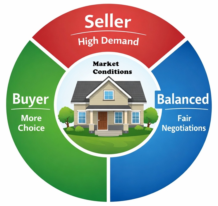 Market conditions shift throughout the year depending on inventory levels, interest rates, and demand. Some periods favour buyers with more choice and negotiating room, while others favour sellers.